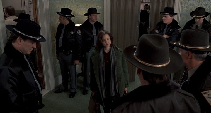 The camera alone does a lot of this storytelling: shots of strange men leering at Clarice juxtaposed against Clarice being surrounded by her peers, large imposing men, ignoring her and simultaneously making her uncomfortable.