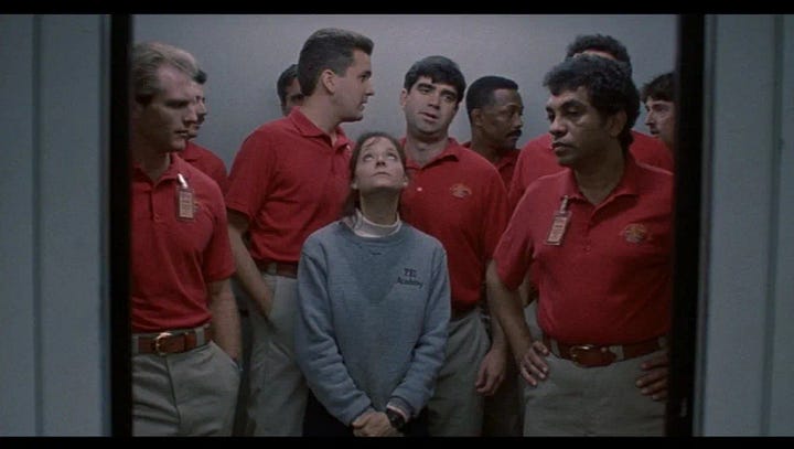 Silence of the Lambs is in many ways about the endurance of women and what it takes to operate as a woman within the patriarchy. It is both about the importance of femininity: Clarice noticing the woman’s glitter nail polish. And the price of femininity: Clarice having to endure disrespect, inappropriate flirting, the assault from Miggs, her femininity being used as a pawn against Dr. Lecter.